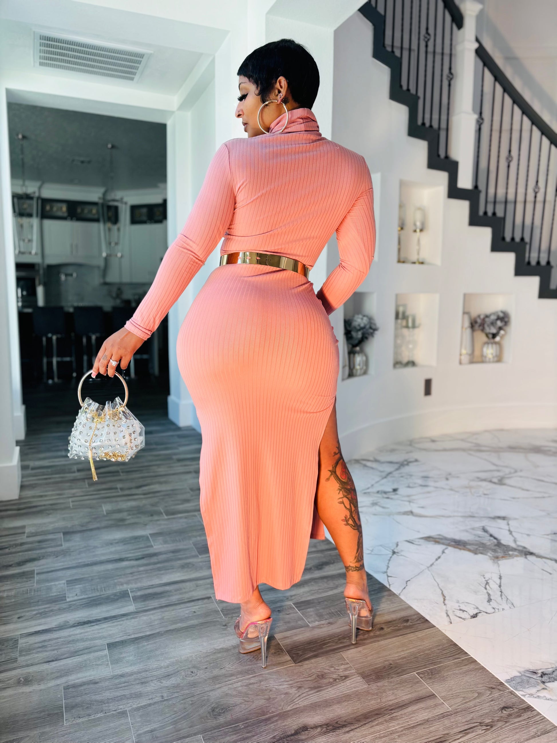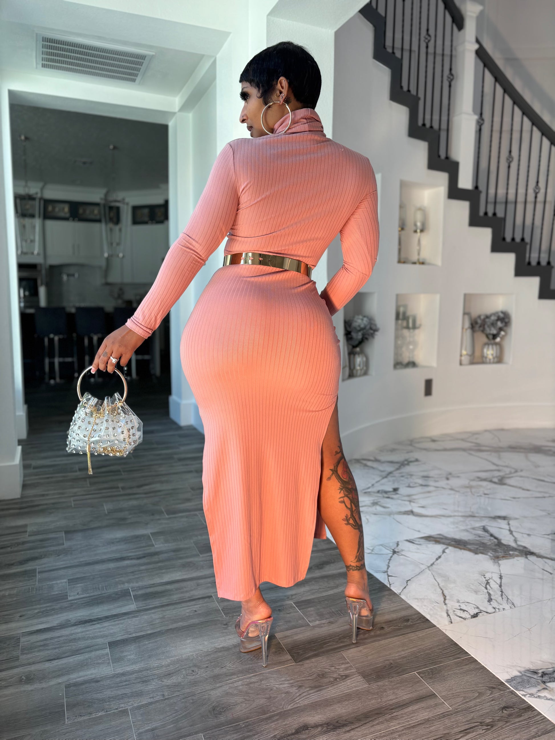 Turtle neck side slit maxi dress long sleeve